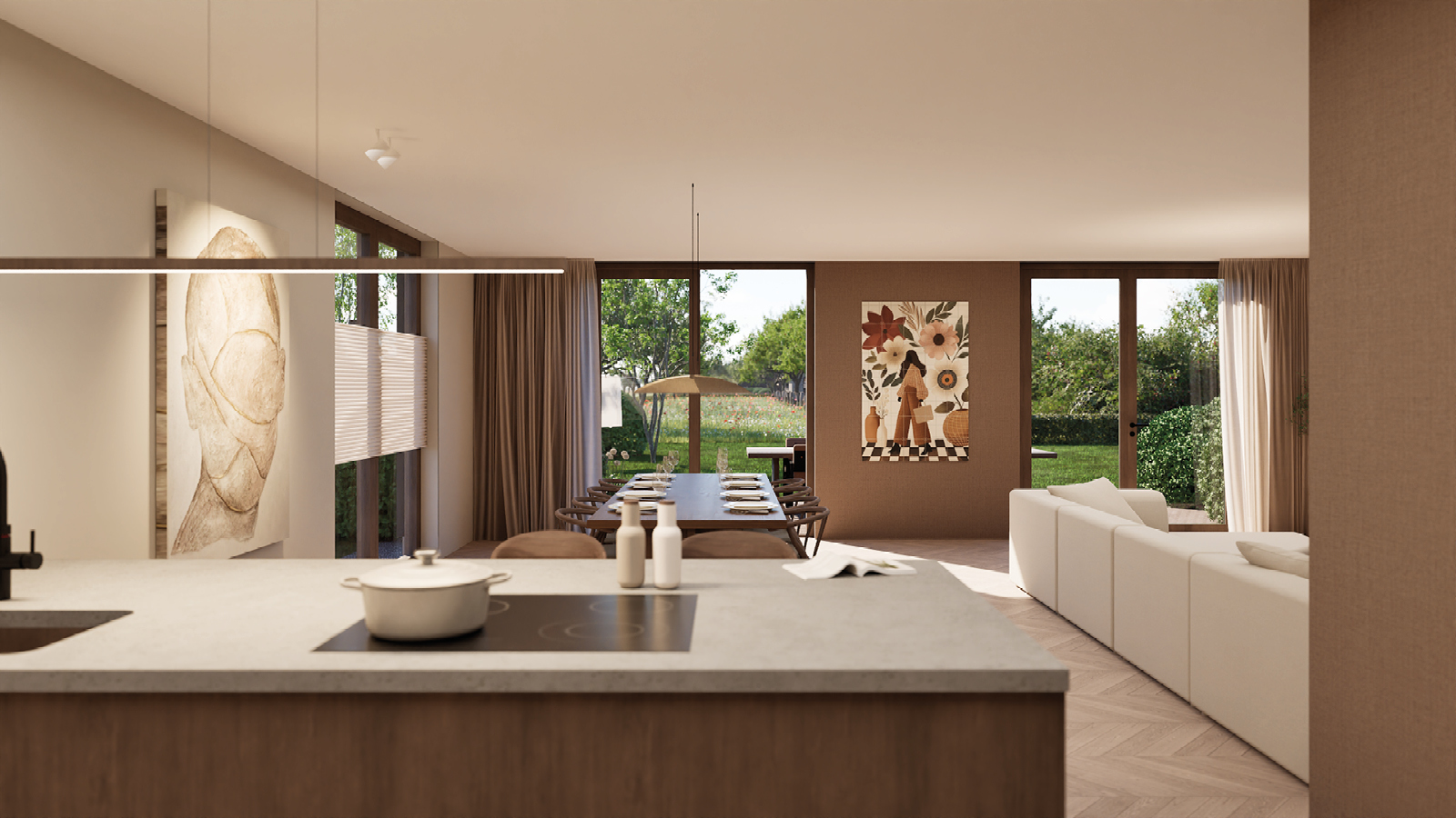 Het warme karakter van de woning gaat binnen verder. Binnen zetten dezelfde tonen de sfeer voort: een tijdloos interieur met donkere houtaccenten en warme kleuren, waar rust en gezelligheid samenkomen.